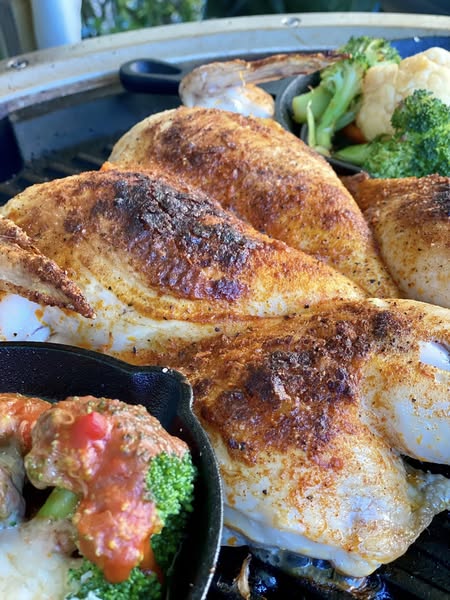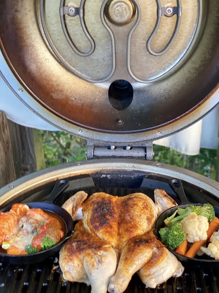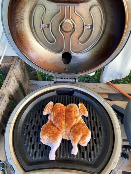 Fjern rygbenet på kyllingen – knæk den i brystet så den ligger fladt – spray med olie – drys med salt, peber og paprika – spray med olie – på indirekte varme ca. 40 minutter alt efter størrelse på kyllingen – thats it thats that.