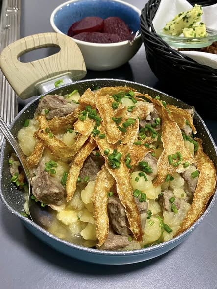 Oscar laver her endnu en af de klassiske retter og absolut en af mine favoritter Lobescoves / Skipperlabskovs tern af oksekød kogt med kartofler genialt – det sprøde på retten er friterede chips af kartoffelskrællerne –
